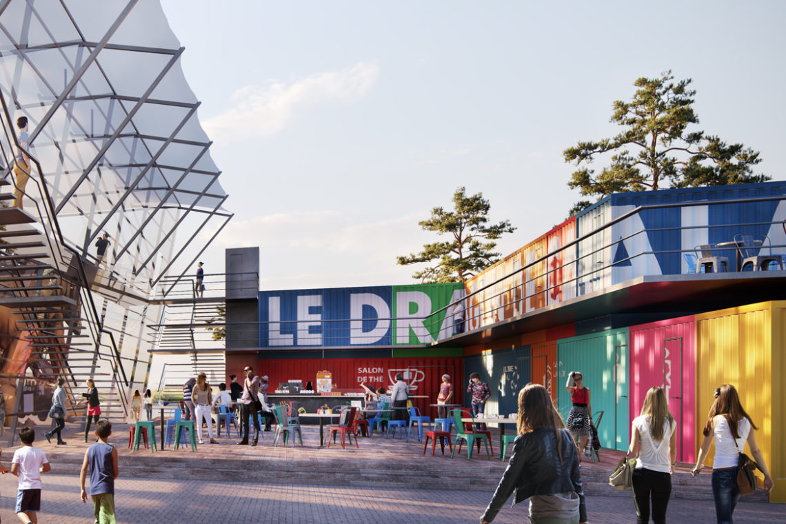 program: construction of a temporary village to house visitor facilities dedicated to the arrival of the Calais Dragon, construction of a 4,760 sq. ft. hangar, assemblage of shipping containers to house the restaurant, gift shop, and offices.