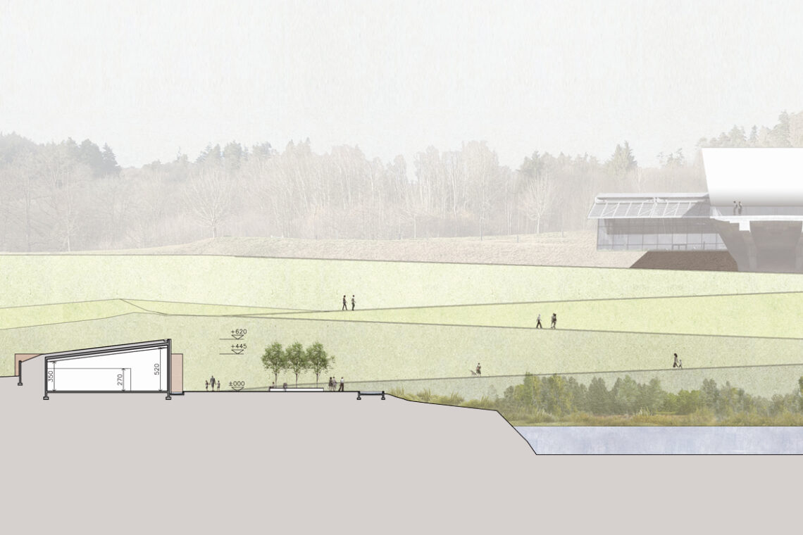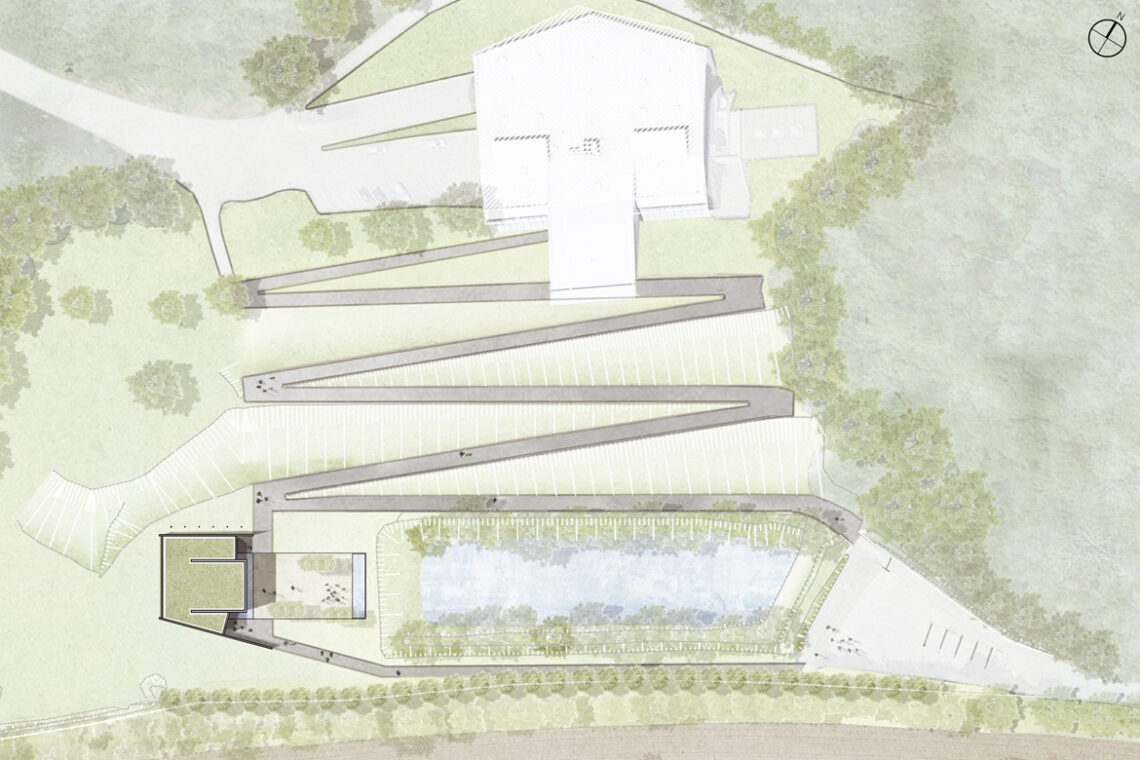 The monument is perceived as a symbolic object on the site, simple and geometric, fitting seamlessly into the continuity of the existing landscape. A place for both the shared and the individual encounter with the stories of those who lost their lives.
